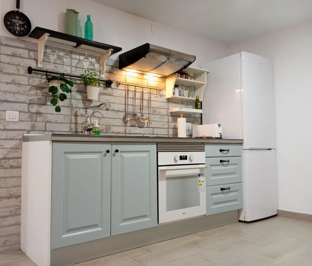 The apartment features a comfortable double bed, a fully equipped kitchen, and a thoughtfully designed interior that allows you to truly relax and reset between dives.